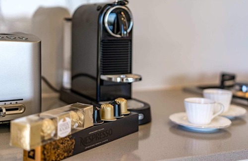 beautiful kitchen with stone bench tops, gas cooking, dishwasher, coffee machine, microwave, kettle, toaster, breakfast far with three stools and walk in pantry
