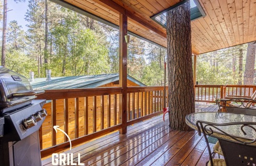 the exterior area of this home boasts gorgeous views and unrivaled privacy A deck leading from the cabin out to tall pines, allowing you to appreciate the breathtaking views from this exclusive cabin. Lounge in the sun on your viewing deck, or enjoy a quaint seating area and BBQ are situated on the deck of this lovely home for use during your stay.