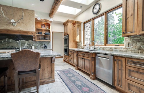 inside, you’re greeted by an expansive vaulted great room, where a dramatic wall of windows frames sweeping river views and fills the space with natural light At the heart of the living area is a stunning wood-burning fireplace, surrounded by exquisite handcrafted stonework, providing a cozy gathering place that serves as both a dramatic focal point and the ideal spot for fireside conversation. Just beyond, the dining room brings a touch of rustic charm with a classic decorative woodstove*—inviting guests to linger over meals in warmth and style. The chef’s kitchen is a showpiece, featuring a massive granite island, Thermador Professional appliances, Sub-Zero refrigerator, double ovens, and rich knotty alder cabinetry—ideal for memorable gatherings. Two walk-in pantries add practical luxury for seamless entertaining.