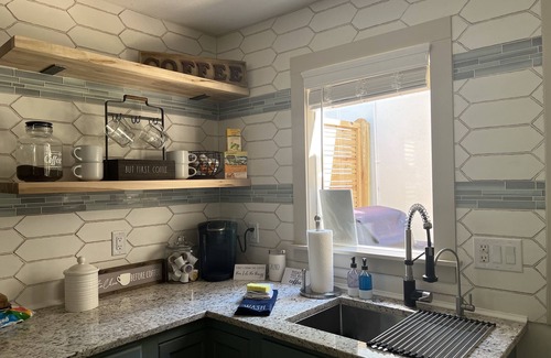 as you enter the home you will find a beautifully decorated cozy living room with gas fireplace, and large screen television The kitchen has been completely updated and remodeled with lots of beautiful natural light & is fully equipped with everything you would like to enjoy while on vacation. A coffee area with a kuerig and traditional coffee maker, and supplies for both, an eat in kitchen, along with a door for easy access to the deck and grill.