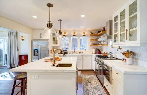 stunningly beautiful and charming house! recently remodeled full cooks kitchen with double oven, wine cooler, coffee service area, full dining room with table extenders and additional seating Living room with 75" TV plus full cable services (Peacock, Netflix, Paramount+, Disney, Max), plus huge selection of DVDs. Patio in back for BBQ and entertaining or quite time.