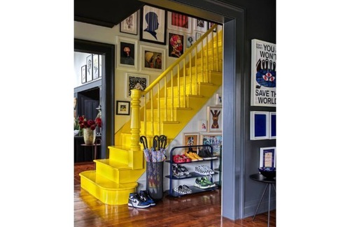 candy yellow stairs lead up an art-covered landing and into the main bedroom suite, a view of the garden, barns, and pool The room is dark gray with a king size Soho House mattress, a reading area with a Faux-candlelight fireplace, plenty of closet and drawer space, and a Vitsoe desk with Eames stool. The main bedroom bathroom has a soaking tub, a black tiled shower, and granite countertops. The Marimekko room is covered in the iconic Uniko flower pattern: the bed linens, a chaise, the wallpaper, and window coverings are all in the print. A view of the Hudson, a queen sized bed, and a vintage Herman Miller writing desk with Eames chairs finish the room. In the Kid's Room, more Marimekko bedding, Artimede lamps, an Eames rocker, and two twin beds (which can be pushed together to a double), fill a pink and orange sherbet hued hideaway. The full bath, with bathtub and shower, is filled with Siouxsie and the Banshees art and vintage posters.