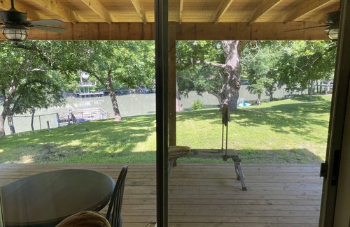 come sit on the 400 sf dock of our sliver of the river on lake placid in mcqueeney texas! fish or kayak (river is low (no jumping off of dock) for dam repairs but we have added a ladder for access to swim and cleared vegetation so there is kayak access under the dock) or just snooze in the hammock Large park like yard for kids/dogs to run around. (No fence though.) Up to 2 dogs under 50 pounds are allowed, must be listed and deposit paid. We have the cabin deep cleaned after each pet stay. Have dinner with a beautiful view of the river from the picnic table after you cook on the charcoal BBQ pit.