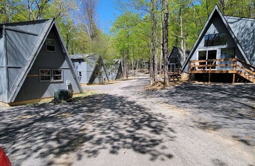 A beautiful, rustic, newly renovated A-frame chalet cabin tucked in the woods on the mountain ridge. Surrounded by mountainous beauty! Walking trails, trickling streams, a 12-acre lake for fishing and seasonal kayaking/canoeing/peddle boating, a heated, indoor Olympic-sized saltwater pool and fitness center. Relax and rejuvenate in one of the two large jetted jacuzzi tubs within the property or sit on the deck and take in the natural breathtaking woodsy views. Walking distance to the Treetop Restaurant. Four easy miles to downtown Berkeley Springs for antique/boutique shopping and the natural springs. On-site massage services available. NO ADDITIONAL CLEANING FEES!.