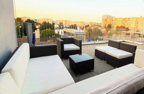 This 1-bedroom apartment with a huge terrace and spectacular view is perfect for families or groups of travellers looking to enjoy Vienna in a luxurious, modern apartment.
