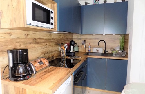 after a walk to the famous central market of royan, you can prepare your meals in the newly renovated kitchen area of this flat! at your disposal a vitro hob, an electric oven, a microwave, a coffee machine, a toaster, a kettle, a dishwasher and a table top fridge..