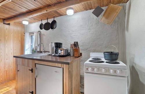 kitchen: cooking basics, coffee maker, stove/oven, mini-fridge, toaster, spices, dishware & flatware, pour-over coffee maker, coffee, sugar & creamers provided