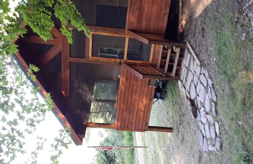 Rustic, 100 year old, one room, primitive cabin in West Virginia along the Cacapon River. Beautifully restored with wood stove, loft, & large screened in porch. Access to 214 acres of private mountain land & over 1/4 mile of river frontage plus 1/2 acre pond, trails, and private shooting range. This cabin is completely off grid. It has NO electricity or plumbing/running water, but does have a Porta-John serviced weekly. Cabin has a bunkbed (no mattress or linens...bring your own bed rolls), two cots, folding chairs, and some deck furniture provided for use. Renter will be essentially camping in a rustic cabin so pack accordingly. To access property, we recommend all renters have a four wheel drive vehicle. Please note that during inclement weather parts of property may become inaccessible due to deep snow or high water. Upon booking, detailed driving directions and cabin manual will be emailed to renter. Please email for details and reservations..