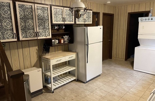 in the living room you will find a recliner sofa, a custom built wooden coffee table in front of the fireplace with a wood burning stove insert, and a custom built, bar height, dining table with four, fabulous green metal stools Take in the gorgeous parkland and wildlife views and from the large bay window in front of the dining table as you sip your morning coffee. The cottage also has a covered front porch at the front of the house with panoramic views, and just outside, guests have access to a large stone patio with a fire pit, and an outdoor fireplace, and Adirondack chairs for relaxing around the fire. Private lake access through the empty lot across the quiet street, and kayaks, paddles and life jackets are available, weather permitting.