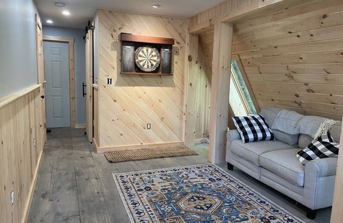 Lovely converted barn with larger eat in kitchen, spectacular water views. Large living room with professional dart board. Large bedroom with comfy bed. Access to private waterfront docks for boating; swimming, or ice skating to the winter. Two Kayaks and a Canoe on property...