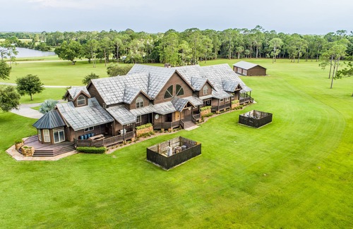 Sunshine Grove Lodge is the perfect retreat to luxury and nature. The grand lodge of 8,200 square feet sits on 800 acres of private grasslands, lush jungles and three lakes in the heart of Okeechobee, Florida. This unique and private rustic lodge in a beautiful landscape is a quick getaway from Orlando, West Palm Beach, Miami and Fort Lauderdale. Large wrap around porch looks out onto expansive scenic grasslands and jungle and is equipped with a grill for cookouts. The large inviting grand entrance lounge, media room, oversized master suite and well equipped kitchen makes the Lodge the ultimate getaway. Guests are free to run, walk and explore the expansive property that once a year is home to the iconic Okeechobee Music & Arts Festival. Fishing and kayaking are available upon request as well. No pets please.