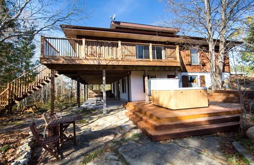 our place offers peace and tranquility protected by towering trees overlooking mississippi river rapids It is a rustic post and beam cottage with all modern amenities and a large walkaround patio. Even inside the nature embraces and surrounds you thanks to our large panoramic windows.