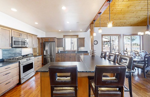 inside, you can continue to experience scenic moments through large, open windows The open-design living, kitchen, and dining areas also provide space for all to enjoy. The living area has ample comfortable furnishings and a fireplace and TV that is perfect for a movie night or two. In the well-equipped kitchen, entertain your guests and whip up their favorite meals. Share light bites at the kitchen island or utilize the dining area for a more formal dining experience. This home also features a miniature living area with a sofa, TV, and desk for further relaxation as well as a washer/dryer and WiFI for added convenience.