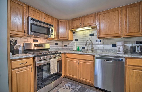 kitchen: fully equipped, stainless steel appliances, granite counters, drip coffee maker, toaster, cooking basics, dishware & flatware, subway tile backsplash, wall-mounted heater,