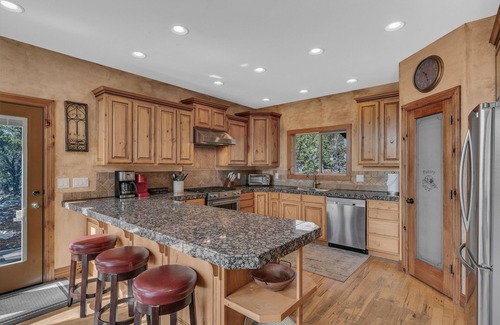 as you step into rustic pines, you'll be enveloped by a warm, inviting atmosphere that seamlessly blends rustic charm with modern luxury The heart of the home is the great room, where a wood-burning fireplace creates a cozy ambiance, perfect for gathering with loved ones after a day of exploration. The open kitchen, equipped with state-of-the-art appliances, invites culinary creativity and shared meals.