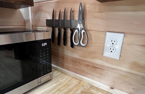 the kitchen is equipped with a versatile microwave (serving as an air fryer, convection oven, and broiler), a built-in two-burner stovetop, keurig coffee maker, toaster, plates, utensils, and more Linens, including fresh sheets and towels, are provided for your comfort, so you can settle in stress-free.