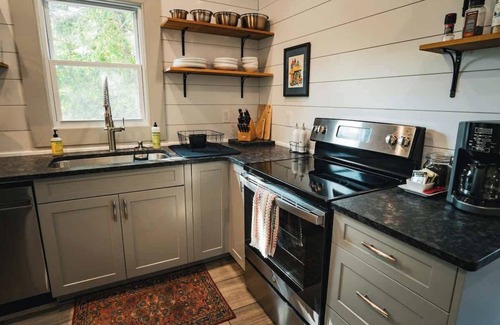adjacent to the living area, the compact yet fully-equipped kitchen boasts modern amenities amidst rustic decor From stainless steel appliances to open shelving it's designed for convenience, ensuring guests can whip up meals with ease.