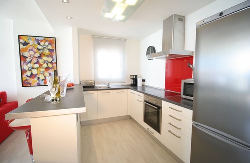 the kitchen is open to the living room, decorated in contemporary red, white and shades of gray From the highest quality materials such as Silestone countertops. A wide breakfast bar with 2 bar stools they separate from the living room a bit. Zeran hob with 'soft touch' switches, oven, microwave, coffee maker, toaster, kettle, generous amenities of crockery, cutlery and cooking equipment, new everything! Large, 2 m high fridge with separate freezer.
