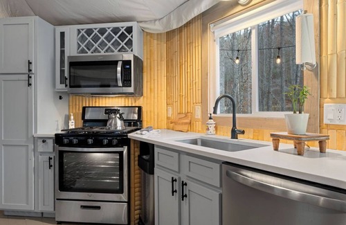 This luxurious safari tent escape is nestled in the Deep Creek area of the Smoky Mountains. The exterior stone-gray canvas blends seamlessly with the forested surroundings. Inside, bamboo walls add warmth and a rustic, earthy feel, beautifully complementing the deep charcoal and slate-gray tones. Rich red accents—like a cozy turtle-shaped footrest infuse the space with, fun, warmth, while soft, textured rugs cover the floor, providing comfort and style underfoot.