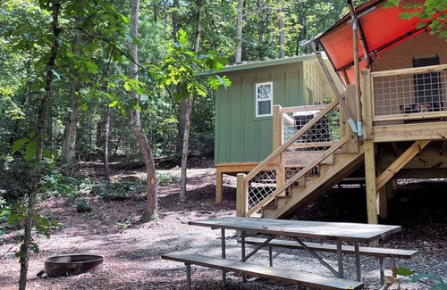 Experience glamping at it's finest tucked away in the woods in our Safari Tent! With a queen bed and a twin over full bunk bed, there is sleeping for 5 so the whole family can come enjoy. The kitchenette features a mini refrigerator, coffee machine, sink, and microwave, and there is is AC/heat in the tent to keep you comfortable. There is a private detached full bathroom, with a skylight to in the sunshine, or the starlight, while you take a warm shower. Outdoor features include a balcony with a gas grill, a creek side fire pit, and a picnic table, so you can relax and enjoy the outside world in luxury.