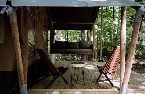 Safari Tent Site 10 | 1 Queen Bed & 1 Bunk Bed | Woods View is located in North Woodstock. Safari Tent Site 10 | 1 Queen Bed & 1 Bunk Bed | Woods View provides accommodation, featuring Fireplace/Heating, Child Friendly, Pet Friendly, among other amenities. This RV Rental features Fireplace/Heating, Child Friendly, Pet Friendly, to make your stay a comfortable one.