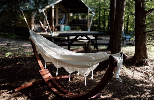 outside the tent, we’ve got you covered with a fantastic firepit & grill, adirondack chairs overlooking the brook, a comfy hammock, a picnic table, and, of course, a beautiful private setting surrounded by trees, overlooking the mountains in the background