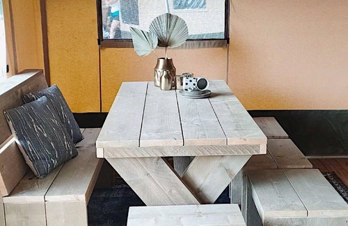 "safaritent 6", 1-room cottage 50 m2 Simple furnishings: living/sleeping room with 2 x 2 bunk beds, 1 double bed, dining table and flat screen. Exit to the terrace. Small kitchen (4 induction hot plates, kettle, microwave, electric coffee machine). Shower/WC. No heating option. Terrace. Terrace furniture. Facilities: Internet (WiFi, free). Please note: non-smokers only. This object is a glamping tent and can be entered via a few steps. A shared hot tub can be used on the field near the glamping tent. Pets on request.
