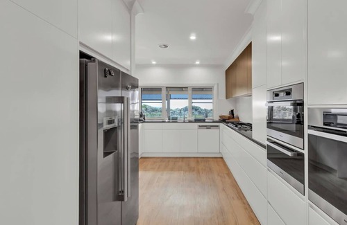 an eight-seater dining table offers a generous setting to share meals, with additional seating at the breakfast bar Sliding glass doors open to a paved patio, where an outdoor table and cosy lounge setting are perfect for alfresco gatherings while you listen to the sounds of the waves. After a day of sightseeing, settle in with a movie in air-conditioned comfort, while a second living area upstairs ensures plenty of space for reading and relaxation.
