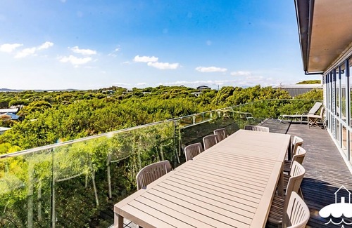 climb the large flight of timber stairs to the main level of the home, featuring a large open plan kitchen, dining and living space, ideal for shared family time on your beach retreat Large North facing windows run the length of the main living area, allowing the home to soak in all of the natural sunlight, whilst capturing the exceptional view across the hills to shallow inlet. A deck also runs this length, perfect for sitting out and enjoying your morning coffee with the dreamy landscape.