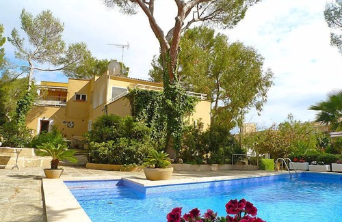 Large, cosy villa "Santa Ponça", 3 storeys. 1.5 km from the centre of Santa Ponça, in a quiet, sunny position, 100 m from the sea. Private: property 1'200 m2 (fenced), biotope, swimming pool angular (5 x 10 m, depth 180 cm, seasonal availability: 01.Jan. - 31.Dec.). Outdoor shower, patio (120 m2), arbour, pergola (25 m2), garden furniture, barbecue. In the house: internet access, WiFi, solarium, air conditioning, washing machine. Stepped path (10 steps) to the house. Parking (for 3 cars) at the house on the premises. Shop 1 km, restaurant 500 m, bus stop 600 m, sandy beach 1 km (small), shingle beach 200 m, diving center 100 m, swimming bay 650 m. Sports harbour 100 m, golf course (18 hole) 2.8 km. Nearby attractions: Palma centro 22 km, Calvià centro 9 km, Parc Natural Sa Dragonera 30 km. Object suitable for 8 adults. The owner does not accept any youth groups. Neighbourhood highly sensitive to noise. Quietness and good behaviour expected. The tap water has no drinking water quality.