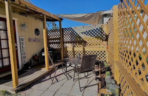 This is a cute studio cottage with a full bath and cold air condition. A pretty outdoor area, private driveway, private parking, secluded yet only minutes to town. Santa's little cottage is cozy and bright!.