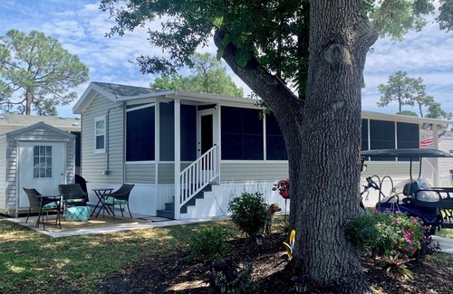 escape to sarasota, florida the award winning southwestern part of the sunshine state close to the gulf of mexico Have fun, relax, and/or stay active in one of the premier, gated RV resorts Sun Outdoors, in the world! Our new, cozy park model home provides you with unlimited access to FULL resort amenities. Boasting 2 queen beds flat screen TV's in each of the two bedrooms, and a brand new queen sofa bed in the central ac/heated Lanai sleeping six comfortably. The main bathroom amenities include tub/shower combination, hair dryer, bath towels, toilet paper, starter set soap/shampoo, etc. An additional 1/2 bathroom is located in the second bedroom (ensuite). Whether you're having coffee on the garden patio, breakfast in the eat-in kitchen, relaxing in one of the two living areas, or exploring the resort, we know you'll enjoy your stay! For guests working remotely, the home has a dedicated office space and private high speed internet.