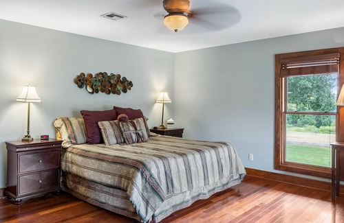a secluded ranch house overlooking a vineyard and serene pond surrounded by pastures and wooded trails Convenient to Round Top, La Grange, Smithville, Bastrop, McDade, and Elgin. many wineries and special events nearby!