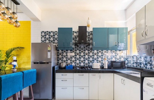 welcome to sazz by alohagoa! a stunning 2bhk apartment lovingly built with pop art décor, attached balconies and a well-equipped kitchen