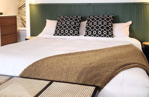 step back in time with the mid century decor but enjoy the luxury of a rainfall walk in shower, workspace and mini kitchen to prep any meal.