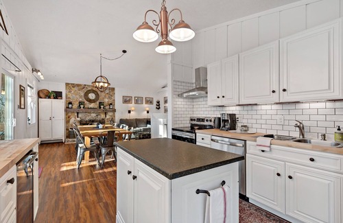 upstairs you will find a remodeled kitchen with an oversized dining table as the centerpiece The kitchen is fully stocked with cookware and tableware for a crowd. The coffee pot is dual-purpose with a 12 cup carafe as well as a Kureg option. (We also provide a moka pot and french press.) The pantry has plenty of space for your own food and snacks. We carved out space for the cozy chaise couch upstairs for reading and relaxing. There are two spacious bedrooms upstairs - one with a king-sized bed, the other with a queen. Each upstairs bedroom has internet TV and DVD player. Upstairs and outside you'll enjoy a wrap-around deck with string lights, a coffee nook, Adirondack chairs, picnic table, and a propane grill.