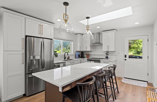 both bedrooms have queen beds, and there's also a queen-sized pullout couch to ideally fit groups of 4-6