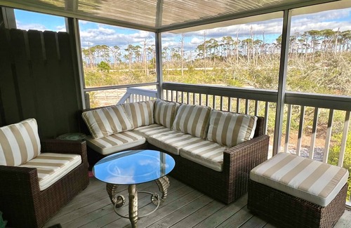 knee deep in paradise is a lovely, pet-friendly, 2 bedroom, 2 bath townhouse, with a sleeper sofa, to accommodate up to 6 guests The first floor welcomes you into an open concept living/dining/kitchen area. We have comfortable seating and a large streaming TV, perfect for family movie nights after a fun-filled day at the beach. Our living area opens onto a wonderful screened-in porch with outdoor seating and a gas grill. We look out towards the St. Joseph's Bay and the entrance to the spectacular St. Joseph Pennisula State Park, which hosts one of the best beaches in the United States, ranked by Dr Beach.
