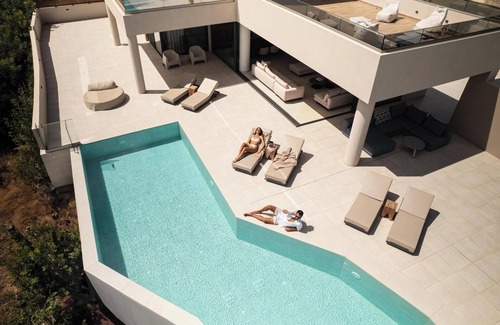 aerial villa spans four levels and 500 m2, offering a smart layout that ensures privacy for all guests It accommodates up to 12 people in 6 en-suite bedrooms, with the option to host 14 by adding 2 folding beds in the playroom.