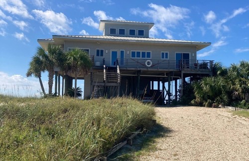 The best of waterfront living. Private Gulf beach plus bayside dock, completely remodeled in 2022. Spacious kitchen and island open to huge living space with high end furnishings and perfect mix of coastal casual and architectural industrial design. Main floor features 10' plus ceilings with exposed beams and steel accents with 180 degree ocean views and porches off of every bedroom. Huge gulf and bayside decks that terrace down to your own private beach. Elevated to maximize views with private elevator. Not counted as a bedroom, there is a bonus widow's watch on the top floor with 360 degree views of the point. Master bedroom spans the depth of the house at over 600 sq feet with spa like bath complete with giant walk in shower as well as outdoor private master shower. No detail forgotten, even an 2nd outdoor shower downstairs and ground level bathroom for beach goers who don't want to leave the beach. Private bayside dock for fishing and crabbing as well. Truly the perfect getaway for the Seafarer or Land Lover alike. If you've been to any of our properties, you know what to expect and the reviews from our homes speak for themselves. All of our AlligatorPointHomes properties can be found on VRBO and are in close proximity if you need more space or plan on having a larger group of family reunion. (Blue Heron 7 bedroom, 5 bath sleeps 20; White Pelican 3 bedroom, 2 bath sleeps 6; SeaGlass Cottage 3 bedroom, 2 bath sleeps 6, Shifting Sands 3 bedroom, 2 bath sleeps 8, Endless Summer 4 bedroom 3 bath sleeps 8). We can't wait to see you at the beach!.