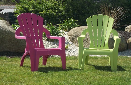 the garden is equipped with two sun loungers, garden furniture, barbecue