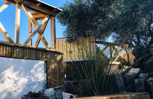 private garden and hidden pool, parking inside or outside, wooden terrace with electric plancha, a beautiful garden with a big olive tree, flowers, palm trees and more