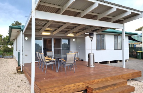 property details: 3 bedrooms - queen; queen; 2 x bunks (4 singles); double sofa bed in living area Sleeps 10; Quilts, blankets and pillows provided; All linen and towels included. Bathroom with walk-in shower, vanity and toilet; Additional toilet. Reverse cycle split-system air-conditioning in living area; Ceramic heater and portable evaporative cooling unit in queen bedroom; Ceramic heating in bunk bedroom and 2nd queen bedroom; Ceiling fans in all bedrooms. Large television (with USB & HDMI port) in lounge room; Wall-mounted swivel television in living area; Televisions in all 3 bedrooms. Spacious sofa seating in lounge room; DVD player in lounge room and bunk bedroom; DVDs; CD player; Radio; Board games; Playing cards; Treadmill. Fully equipped kitchen with electric oven and stovetop, microwave, rain water, Nespresso coffee machine (guests need to bring standard compatible pods or purchase locally), dishwasher and large side by side fridge/freezer. Bar fridge; Kitchen appliances including kettle, toaster, sandwich press, rice cooker, electric frypan, mixer and blender; Ice maker. Front load washing machine; Clothes dryer; Rotary clothesline. Entertaining area on elevated undercover front deck, with sea views; Outdoor seating and dining; Patio heater. Hooded gas barbeque; Gas ring for cooking crabs; Outdoor shower. Unfenced yard; Fire pit (guests need to bring their own wood & observe fire regulations). Ramp access to house at rear. Beach access path directly across the road. No guest access to garage; Off-street driveway parking for 3 cars. Pets by arrangement only ($100 refundable bond applies per pet) - outside pets accepted.