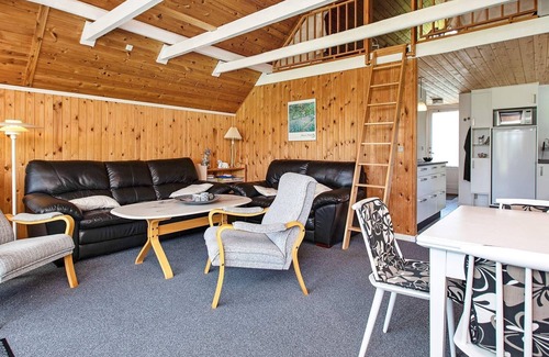This holiday home is located by Hummingen, one of Lolland's most beautiful beaches. The cottage is furnished with an open kitchen with a fantastic light, two bedrooms and a bright living room with both access to a covered terrace and access to a large loft with two beds. There is a bathroom with toilet, sink, shower and underfloor heating. In the attached annex there is the possibility of two more beds. The kids will love playing in the cave in the tree while the adults enjoy a cool drink on the patio while the grill handles dinner. Not for rent to youth groups.