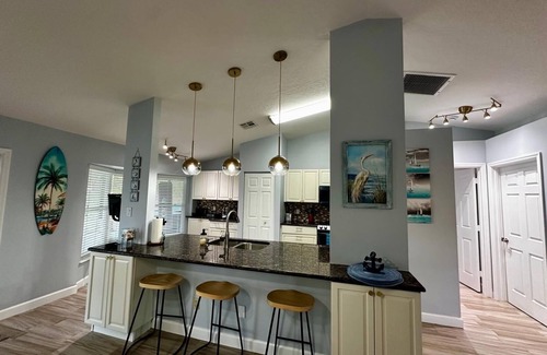 This House is in a nice, safe neighborhood. Grocery stores and gas stations are just a few miles away. You can see SpaceX launches right from the pool or the backyard. The covered lanai is great for feeling the tropical breeze during the day or relaxing on calm nights without the bugs.