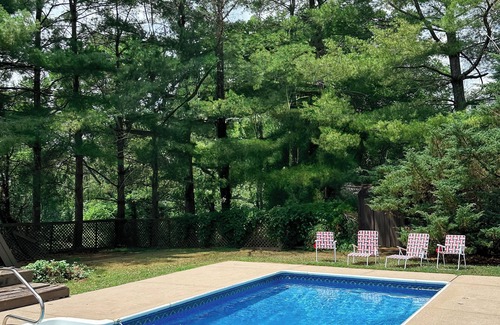 Escape from it all at the A-frame on 22 wooded acres filled with wild life. Slow down and relax inside the calm, peaceful space designed with a modern cabin retreat aesthetic. Put on a vinyl record while you play a board game, do a puzzle, or read a book. Hike the property, explore the cave, or take a swim in the pool. Cook a meal in the beautiful and fully stocked kitchen, unwind with a bath, and drift off to sleep in one of the beautiful bedrooms..