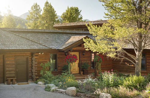 this is one of the few jackson hole homes in which you notice what’s inside before you notice what’s out the windows Tucked into forested lot on a hillside above the Snake River, the Rocking V is more about intimate views than grand vistas of the surrounding mountain ranges. Still, you can see the Tetons through a wall of windows in the great room and, using the homeowner’s telescope, in summer you might even spot climbers on the summit of the Grand Teton. In winter you can watch the tram at the Jackson Hole Mountain Resort deliver skiers to the top of Rendezvous Peak. You can also move the telescope outside the nearby deck and stargaze.