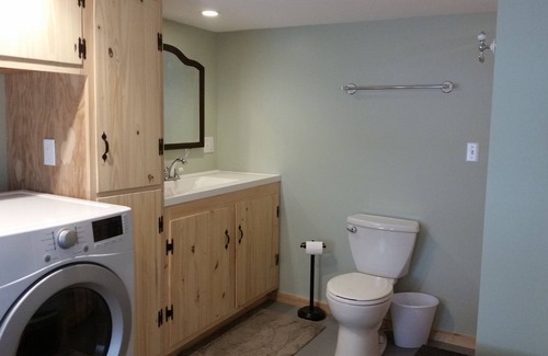 camp has been completely remodeled with knotty pine throughout, area rugs, and new furniture With two levels, the main floor is open and consists of a living room (right on the lake) with the kitchen and dining area all in one cozy space. A breakfast bar provides additional seating and new appliances give camp a comfortable finished feel while the bathroom offers a shower, toilet, washer, and dryer. The upstairs loft has also been finished with knotty pine, wall-to-wall carpeting, and has two beds, a queen and a double.