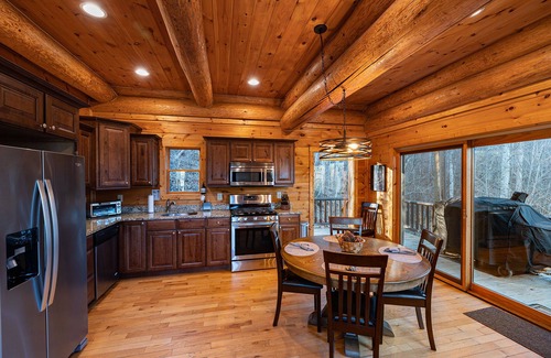 stepping inside, you will quickly understand why this is one of the most popular cabins in the area The spacious great room features cathedral ceilings with a full wall of chalet style glass windows, which bathe the cabin?s rich exposed log beams in daytime sunlight. In front of a massive stone fireplace are comfortable leather sofas with plush throws, ready for you to curl up with a good book or to settle in to watch your favorite movie. The chef-inspired kitchen is stocked with everything you need to create gourmet delights. The cabinets are filled with everything from spices to specialty culinary tools, including high end cookware, a mixer, waffle iron, and even an ice cream maker. The kitchen features a modern gas range with convection oven, as well as a dishwasher. Located just off the great room is the spacious master bedroom with a king bed, set with luxurious bedding. The bedroom is highlighted by the elegant wall mounted gas fireplace, perfect to warm yourself by after a late night soak in the spa -- found just outside the bedroom?s doors. The main level also features a full bath with luxury linens and amenities, as well as a utility room with available washer and dryer. If you must log in to your work email while away, a desk and chair are located in a nook beside the staircase, and the cabin is connected with WiFi internet.