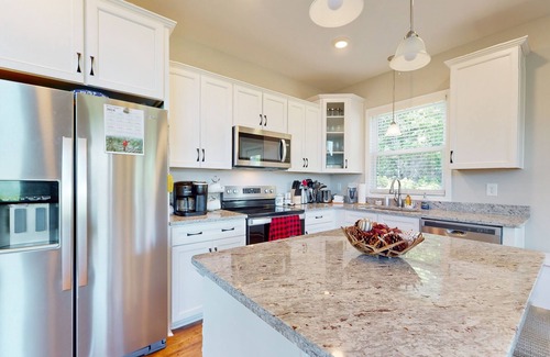 inside, you'll find a beautifully appointed home with a king bed, queen bed, twin bed, and a loft area for additional sleeping space The house is equipped with all the amenities you need for a comfortable stay, including a fully stocked kitchen with modern appliances, a cozy gas fireplace, and a game room for entertainment.